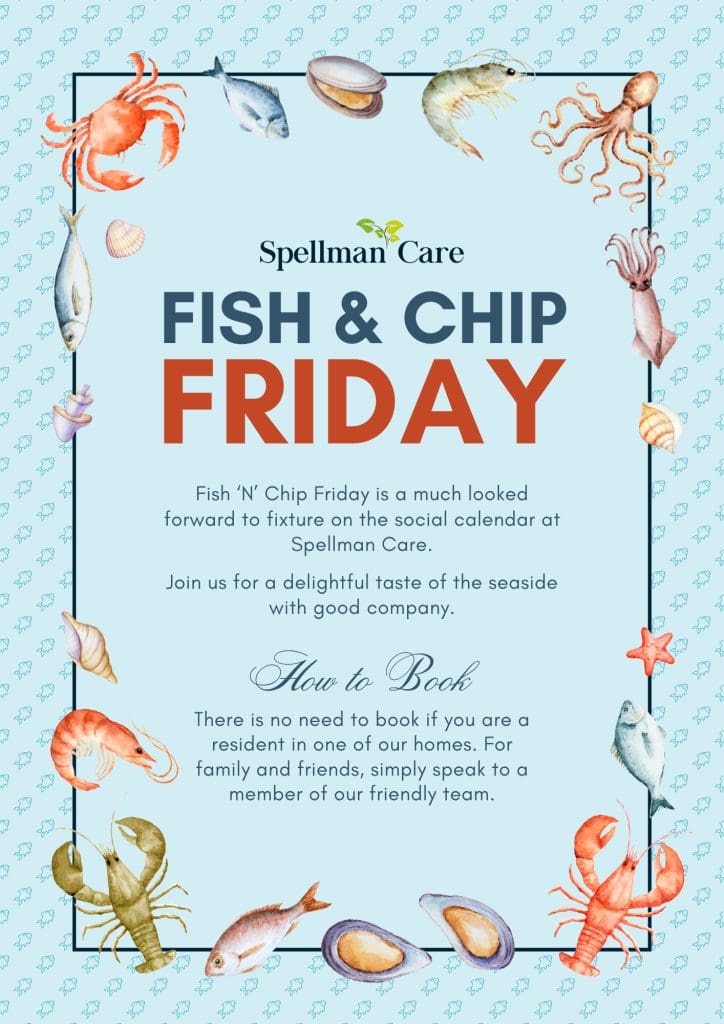 Fish ‘N’ Chip Friday is a much-loved highlight of the social calendar across all our Spellman Care homes. It is a wonderful opportunity for our community to come together and enjoy a delightful taste of the seaside in great company.